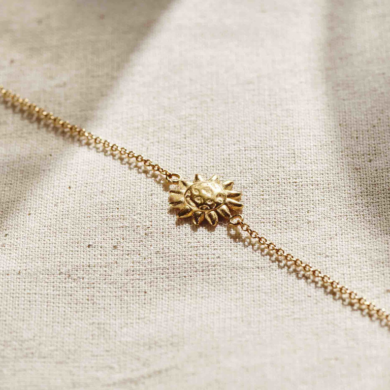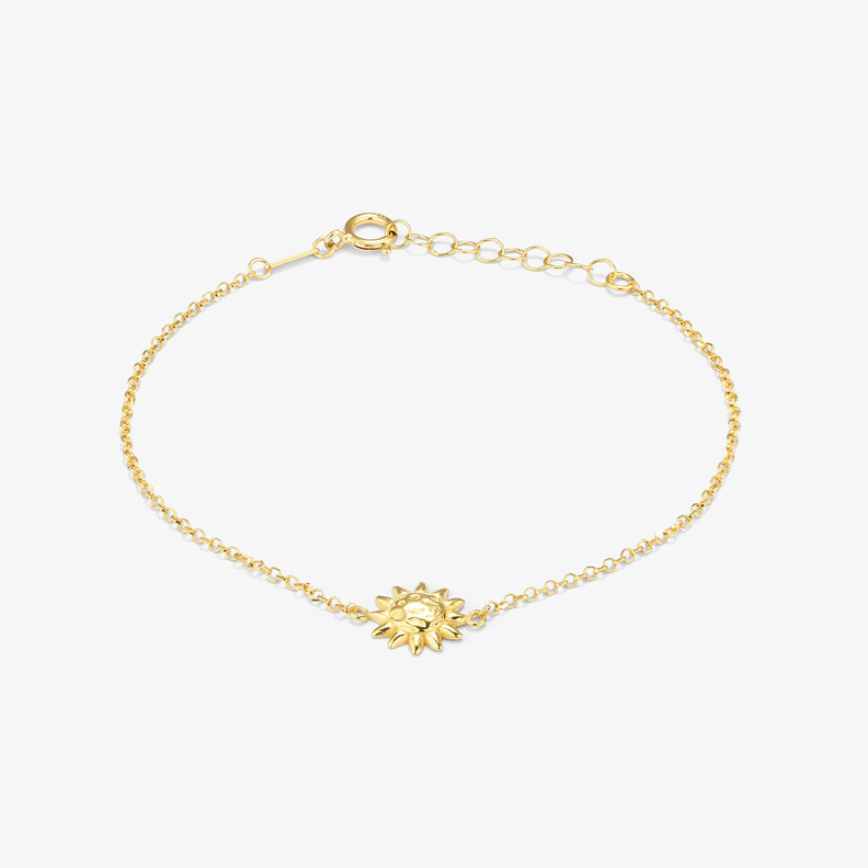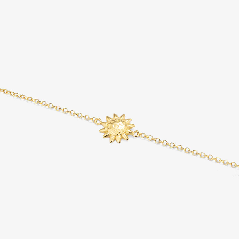 Añadir chispa a todos los estilismos, incluso aquellos que a priori no se prestan a ser llevados de manera más especial, es posible gracias a las diferentes joyas que componen la colección ""Sole"". Los soles en forma de complemento actuarán de forma sutil, para iluminar ciertas partes del cuerpo e incluso podrán insuflar ánimo y energía en aquellos días en los que la rutina laboral más gris pesa sobre nosotros. Pulsera en acabado dorado, la forma de sol hará que pongas el brillo en todas las fiestas de verano."
