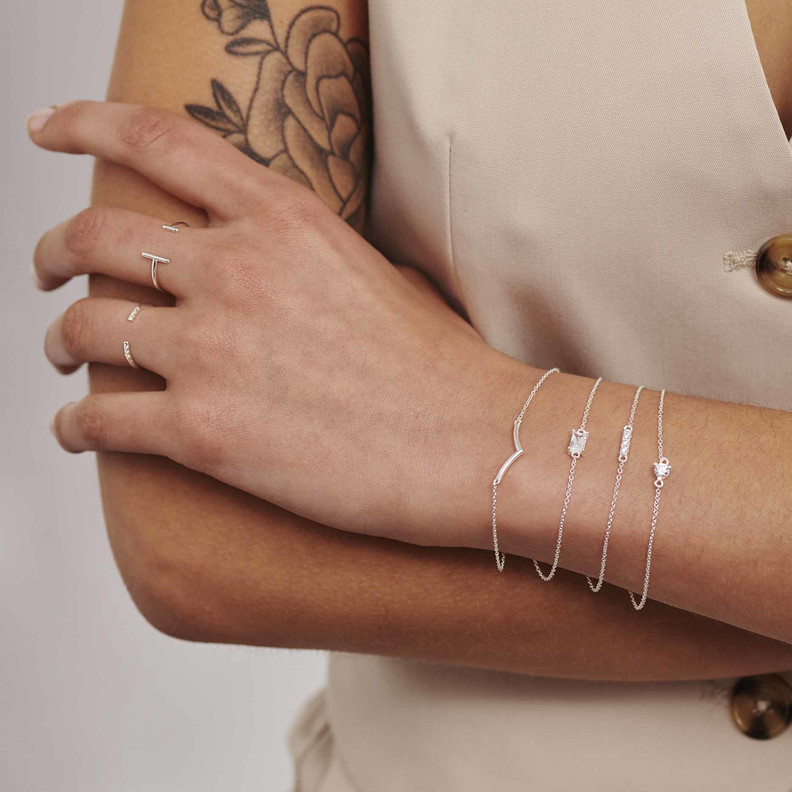 Si actualmente hablamos sobre la durabilidad de nuestras prendas de ropa y cómo elegir las piezas que mejor y durante más tiempo amorticemos, deberíamos extrapolar la misma conversación a otro elemento clave de nuestra imagen: las joyas". Pulsera fina acabado en plata con diseño en uve."