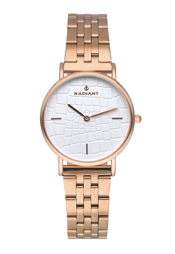 COCO Un clásico renovado. La preciosidad de la piel de cocodrilo se ha visto reinterpretada a lo largo de la historia de la moda. Radiant lo ha hecho huyendo de la tradicional aplicación en las correas y ha buscado una nueva forma de ensalzar su belleza, aplicando el estampado en las esferas con una técnica de relieve. Esta joya de reloj se ofrece en oro amarillo, oro rosado, gris antracita y plateado.