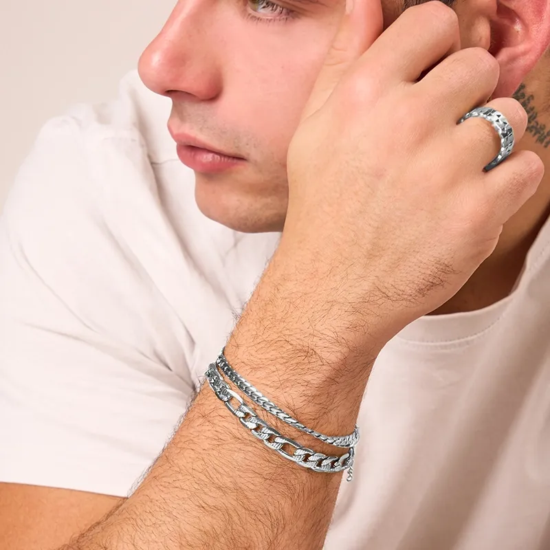 El anillo Chain Padlock en plateado para hombre es una propuesta que fusiona estilo industrial y diseño elegante con una ejecución impecable. Fabricado en acero inoxidable de alta calidad, este anillo presenta un diseño estructurado con cadenas entrelazadas que envuelven el dedo formando un círculo robusto y visualmente impactante. Su acabado pulido resalta cada eslabón con brillo sutil, reforzando una estética moderna y cuidada. Este anillo hombre acero destaca por su equilibrio entre presencia visual y funcionalidad, convirtiéndose en un accesorio hombre perfecto para quienes desean una joya con personalidad sin renunciar a la versatilidad. Ideal tanto para complementar looks urbanos como para añadir carácter a conjuntos formales o minimalistas, puede llevarse solo como pieza protagonista o combinado con otras joyas hombre para una propuesta más elaborada. Chain Padlock plateado es una elección sólida y refinada para hombres que valoran el diseño estructurado, los materiales duraderos y un estilo que transmite seguridad con elegancia.