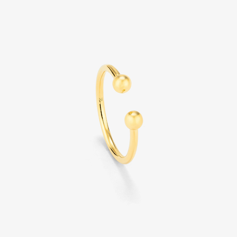 Si actualmente hablamos sobre la durabilidad de nuestras prendas de ropa y cómo elegir las piezas que mejor y durante más tiempo amorticemos, deberíamos extrapolar la misma conversación a otro elemento clave de nuestra imagen: las joyas". Anillo auto ajustable con dos bolas centrales acabado dorado que podemos combinar con otros anillos finitos y de diferentes estilos."