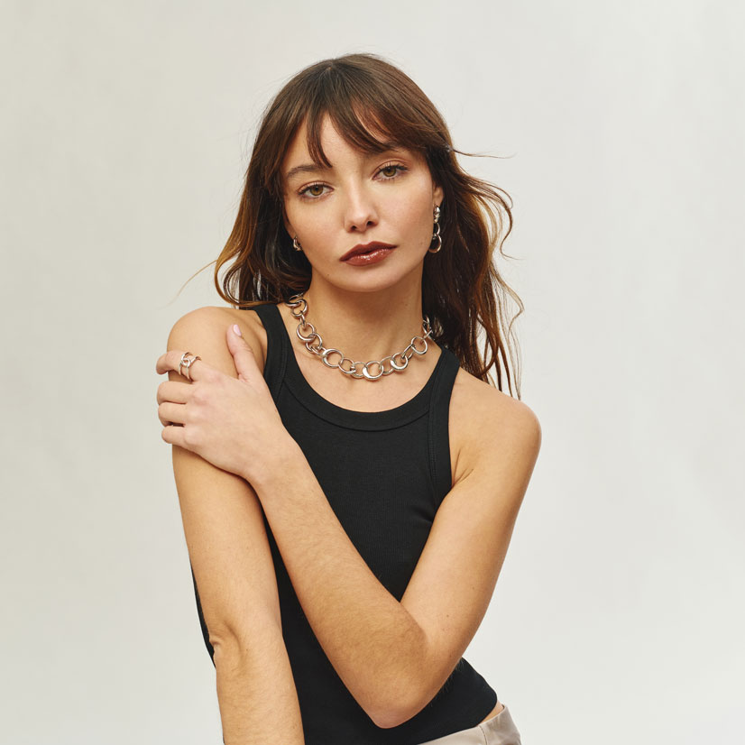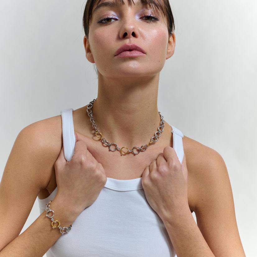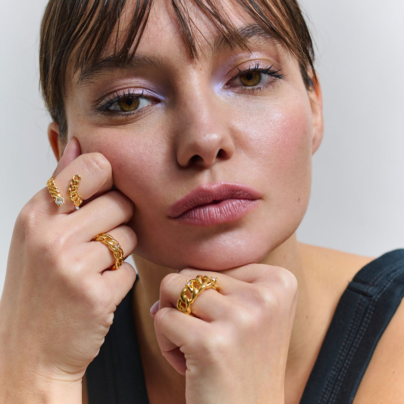 Las cadenas se unen entre sí para crear formas orgánicas y juegos de volumen que aportan luminosidad en rostro, manos y muñecas. Combina los diferentes entre ellos para crear looks versátiles que no dejan indiferente a nadie.