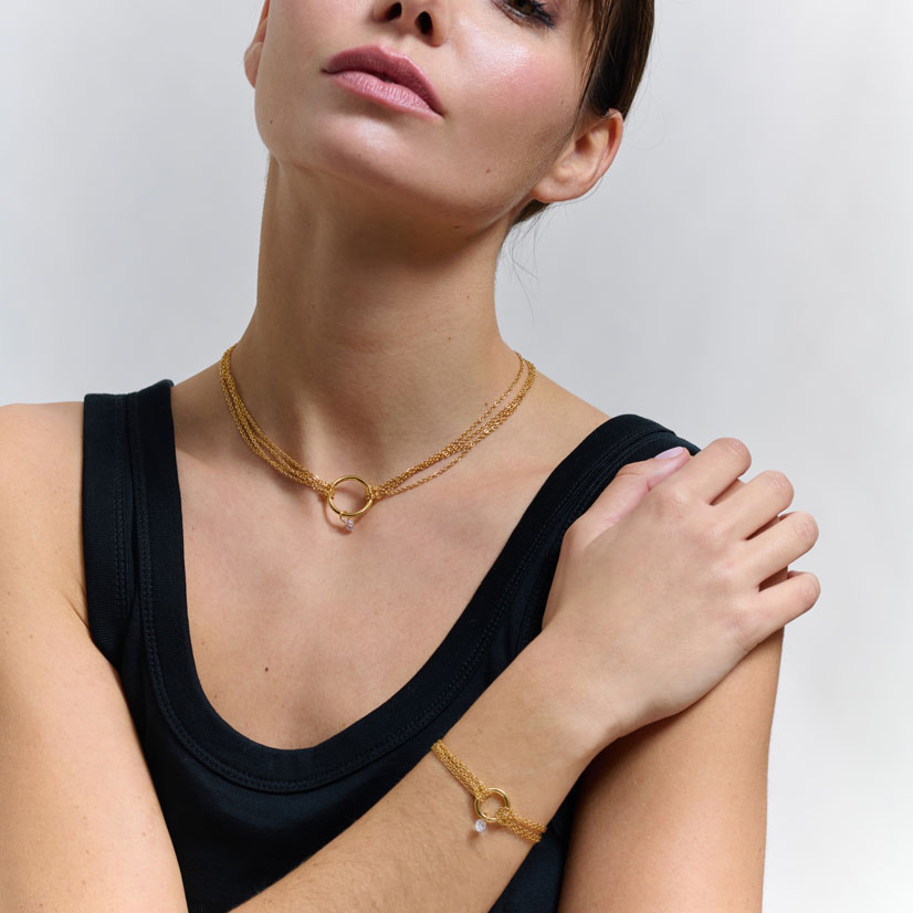 Las perlas, icono de la joyería clásica, se reinventan en una colección que une el pasado con el presente. La modernidad de las cadenas inspira la feminidad más vanguardista, combinando collares de perlas, pendientes dorados, pulseras y cadenas delicadas, cómo símbolo de elegancia y exclusividad.